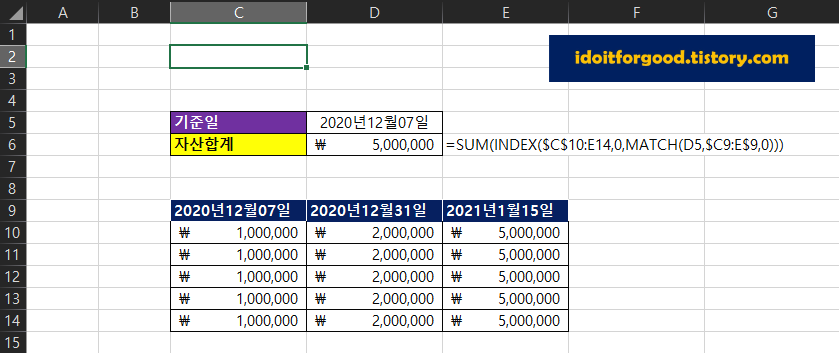 1. SUM / INDEX / MATCH 함수 사용하여 '기준일'에 기입된 날짜 예) 2020년12월07일의 금액 합계 구하기